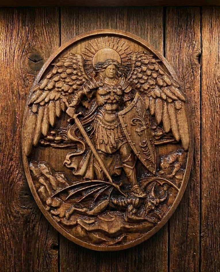 Sculptura ovală Sf. Arh. Mihail. Materialul folosit este lemn masiv, esența depinzând de dimensiunile cerute. Esențele pot varia între: paltin, cireș, stejar, tei. Toate sculpturile sunt realizate pe bază de comandă, termenul de livrare fiind între 7–10 zile lucrătoare. Dacă produsul este disponibil pe stoc, acest lucru va fi comunicat telefonic. Pentru alte dimensiuni, vă rugăm să ne contactați la (0743) 080 985.
